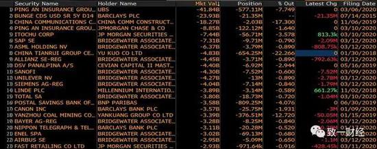 为了便于理解桥水的做空头寸究竟有多大,直接看彭博对全世界做空头寸的排名:前二十中桥水占了9个,其他排名前二十头寸都是UBS大小摩巴克莱等投行(不是自营交易,替客户托管做空头寸的),没有哪个对冲基金像桥水这样大规模做空。