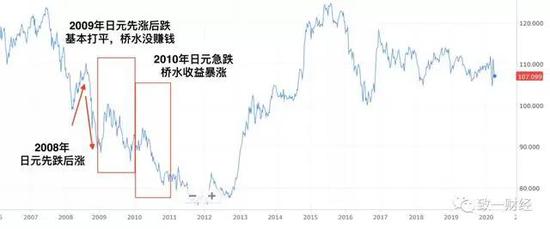 同样的日元也是如此,2008年先跌后涨(图中是USD/JPY也就是美元比日元,USD/JPY的上涨相当于日元相对于美元下跌),到了年末桥水才赚钱。即使是9.4%的收益,2008年桥水也是绝对耀眼的存在之一。
