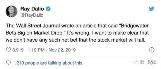 这里不得不补充一点,前段时间网上热传去年11月桥水与投行签下价值15亿美元的做空头寸,认为在2020年3月之前市场会出现大规模下跌,一度被传为神操作。事实是规模1600亿美元的桥水,考虑对冲基金的杠杆系数,15亿空头头寸完全不够对冲资产多头,更不用说后来达里奥澄清“没有任何净空头头寸来赌市场下跌”: