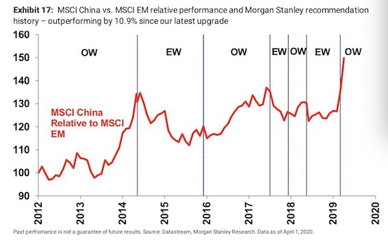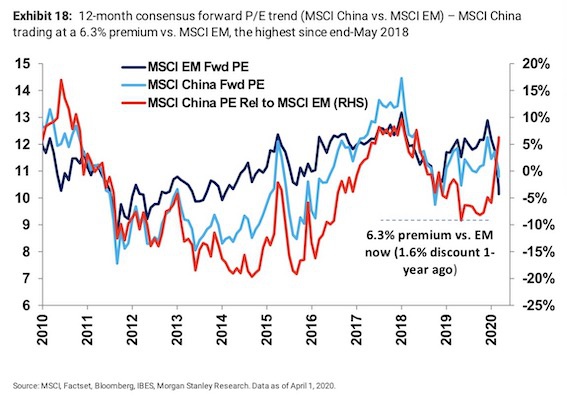 早在3月1日,全球仍处于疫情全面爆发初期,中国正在有序复工,当时摩根士丹利表示上调中国到超配(Overweight)。自那以来,MSCI中国跑赢MSCI新兴市场约1090bp,前者相对后者的12个月远期市盈率已从0.5%的折价攀升至6.3%的溢价。