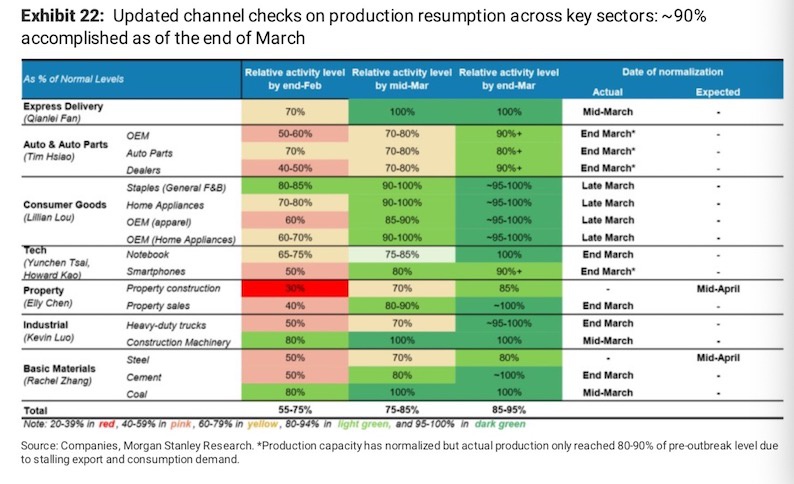 根据摩根士丹利分析师调查,目前中国超过90%的生产活动都已恢复,关键行业已经在3月底回到正常水平,除了房地产建筑、钢铁等行业,有望在4月中正常化。