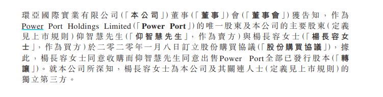 不过在仰智慧解除危机之前,其持有的环亚国际实业却被易主。根据环亚国际实业1月8日公告,仰智慧将其持有的Power Port Holdings Limited股权转让至独立第三方杨长容。Power Port主要持有上市公司25.5%的股份,转让完成后,杨长容成为环亚国际实业第一大股东。