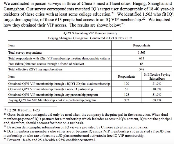同时,浑水对爱奇艺的VIP做了调查,认为大约31.9%的用户是通过爱奇艺的合作伙伴,如京东、小米和携程等的会员关系,来登录爱奇艺观看会员专享内容。