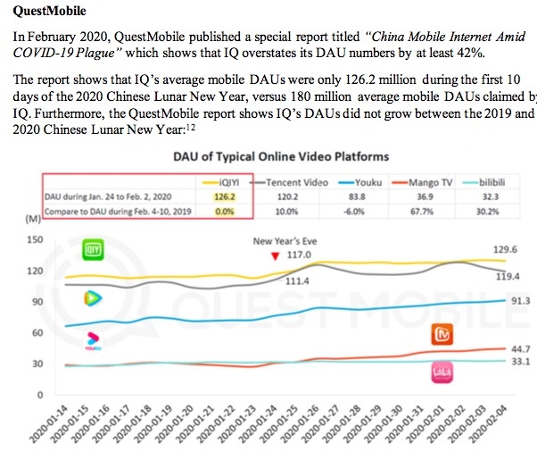 做空报告引用了部分QuestMobile的报告内容。浑水从其报告中截取了部分PPT,认为爱奇艺在春节前10天的DAU据统计仅1.26亿,与其自称的1.8亿的DAU相去甚远。此外,QuestMobile报告显示,在2019年至2020年中国农历新年,爱奇艺的DAU并没有增长。