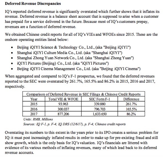 此外,浑水把爱奇艺的多张报表综合后发现,爱奇艺的递延收入(deferred revenue)也是夸大了的。甚至认为,这早在爱奇艺IPO之前就已经发生了!