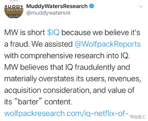这份做空报告由Wolfpack和浑水一起写的,浑水在Twitter上声称已经做空了爱奇艺。