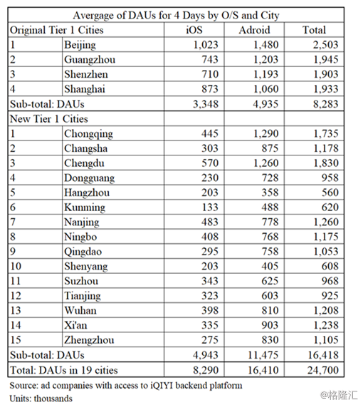 Wolfpack从两家广告公司提供的爱奇艺后端数据中收集了2019年9月中国19个一线城市同一周4天(3个工作日和1个周末)的DAU数据。这些数据显示,移动DAUs的平均值是2470万.