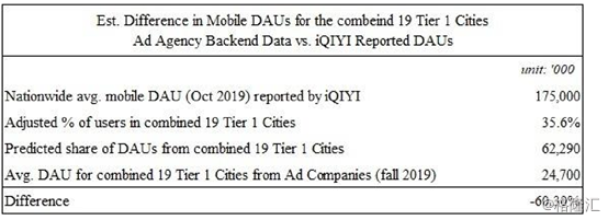基于爱奇艺在2019年10月披露的1.75亿个移动DAUs的平均数量,以及爱奇艺在2019年报告中披露的1线城市中35.6%的DAUs,Wolfpack预计中国1线城市将有6229万个(1.75亿x35.6%)DAU。然而,Wolfpack从广告公司提供的后端数据中发现,在一线城市中只有2470万个DAUs。这比爱奇艺披露的数据低了60.3%。