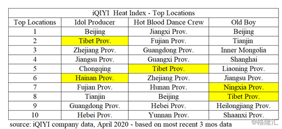 中国大陆有23个省、5个自治区、4个直辖市(北京、上海、广州、深圳),人口由国家统计局单独报告。在这32个地区中,西藏的人口一直排在最后,从逻辑上说,西藏不应该出现在爱奇艺任何节目的前10名。然而,最近对《老男孩》、《偶像制作人》和《热血舞团》等爱奇艺热门节目的调查发现,人口很少的地区,如西藏、海南、宁夏和内蒙古,也进入了前十。