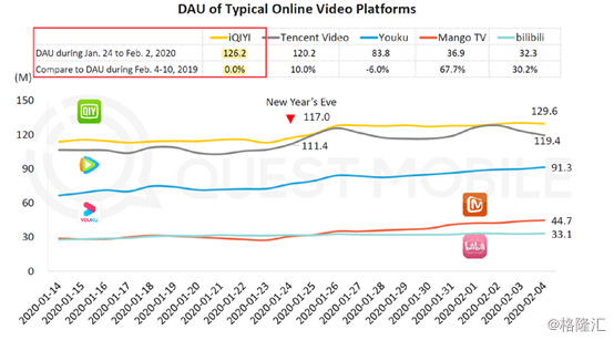 该报告显示,在2020年中国春节假期的前10天里,爱奇艺的平均移动DAU只有1.262亿,而爱奇艺声称的平均移动DAU有1.8亿个。此外,QuestMobile的报告显示,在2019年至2020年的中国农历新年期间,爱奇艺的DAU并没有增长。
