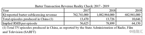 以爱奇艺上报的BarterSublicensingRevenues为参考,意味着2018年和2019年在中国制作的每一集电视剧的交易价格分别为7.9万元和6.4万元。而一位从事内容购买的前爱奇艺员工向Wolfpack透露,非独家的电视剧内容通常在每集价格1000~5000元人民币左右,即便是一个非常受欢迎的节目,最多也不超过20000元人民币每集。