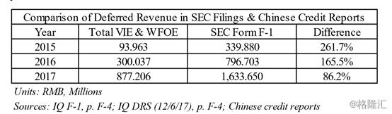 Wolfpack从2015年起获得了爱奇艺所有VIEs和wfoe的中国信用报告。当Wolfpack汇总并与爱奇艺的招股招股说明书进行比较时,Wolfpack发现向SEC报告的递延收入在2015年、2016年和2017年分别被夸大了261.7%、165.5%和86.2%。