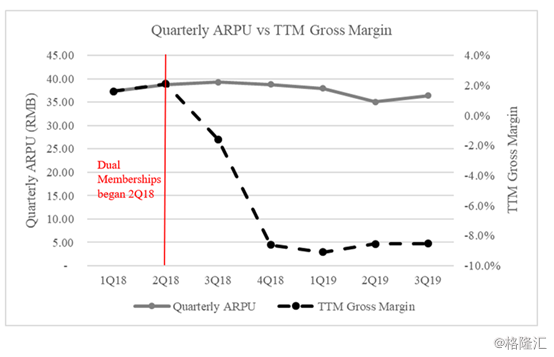 当Wolfpack比较爱奇艺的ARPU和它自上市以来的毛利率时,就可以很清楚地看出爱奇艺滥用双重会员制度的程度。由于爱奇艺在总基础上包含了这两种成员身份,所以它的ARPU一直保持相对稳定,而它的毛利率却直线下降。