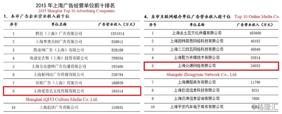 IQ的主要广告公司是上海爱奇艺,第二广告公司是中源,它的收入在上海工商总局2015年十大网络媒体公司的报告中有所报道。