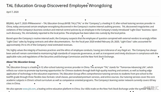 据悉,这名雇员已被当地警方拘留。好未来公司怀疑问题员工与外部供应商合谋,伪造合同等文件,错误夸大"轻量级(Light Class)"的销售数据。"Light Class"销售占公司2020财年总收入的3%到4%。