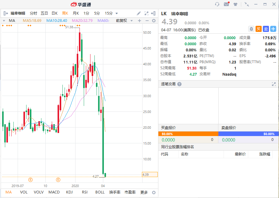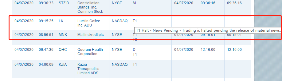 登陆纳斯达克网站,我们可以看到,此次瑞星咖啡的停牌原因代码为T-1—重大消息公布(Trading is halted pending the release of material news),复牌时间未公布。
