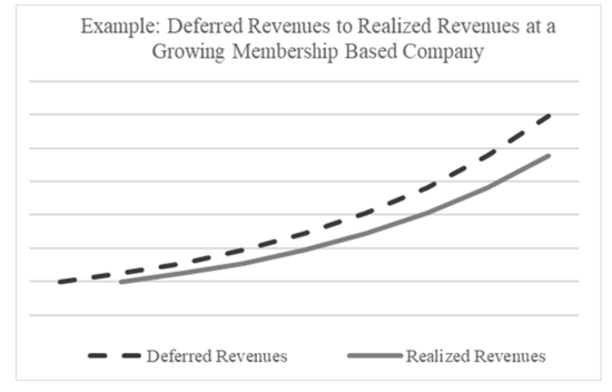 下图是一个例子,说明如果管理层的说法属实,我们会看到的结果。递延收入曲线始终领先于已实现的收入曲线,因为用户为未来提供的服务支付更多的预付款。