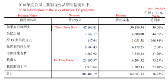 DDMC公布的“如果岁月可回头”总收入为47169万元,“毒猎人”总收入为23196万元。这两个节目对DDMC在2018年的影视媒体部门盈利至关重要。“如果岁月可回头”是主要的收入来源,实现了36.00%的毛利率。“毒猎人”是第六大收入来源,毛利率为73.25%: