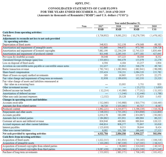 爱奇艺在其现金流量表中列出了三个与内容相关的项目:授权版权的摊销,自制内容的摊销和减值,以及授权版权的减值。由于是摊销费用,每个费用对运营现金流都有正面的贡献。在“经营资产和负债的变化”项下,列出了自制内容的现金流出。它们与其他项组合在一起,合成了总的运营现金流。爱奇艺最大的现金支出,“获得许可的版权”被记录在“投资活动的现金流”下面。“通过从运营现金流获取授权版权的现金流出,并将其记录在投资现金流项下,爱奇艺的运营现金流看起来是正的。