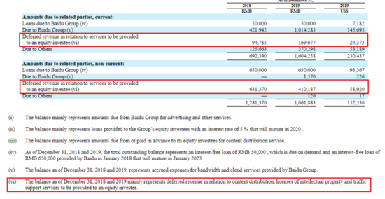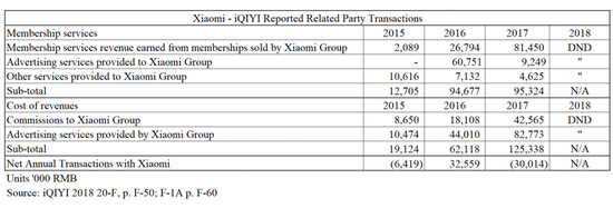 截至2017年年底,小米作为关联方被报道,爱奇艺与小米的交易细节在爱奇艺的招股说明书中也有介绍。虽然小米继续将爱奇艺作为关联方进行了披露,但爱奇艺并没有这样做。下表是爱奇艺的2018年20-F中的一个节选,显示了这些历史交易的内容。