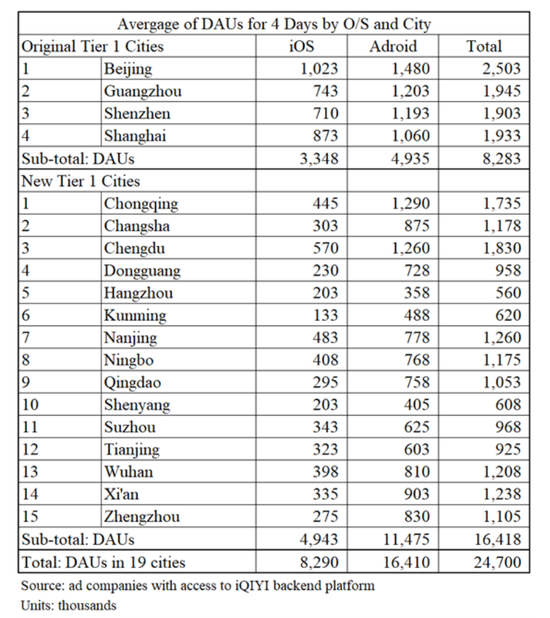 根据爱奇艺在2019年10月披露的1.75亿的移动日活平均数和上述在2019年报告中披露的35.6%的一线城市的日活数据,我们预计中国一线城市的日活为6292万(1.75亿×35.6%),但从广告公司提供的数据中,我们发现一线城市的日活只有2470万。这比从爱奇艺披露的数据中计算得出的数字要低60.3%。