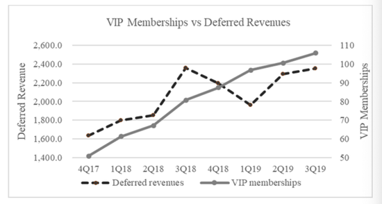 由于爱奇艺的管理层声称其新增了1610万净付费用户,而且在18年第三季度至19年第一季度,平均订阅期从6个月左右增加到8个月,因此我们预计随着预付费的积累,递延收入会有明显的增长。然而,我们发现情况恰恰相反。下图是爱奇艺报告的付费用户与报告的递延收入余额对比。