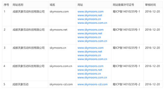 在我们对天象互动的尽职调查中,我们发现爱奇艺甚至没有收购天象互动的所有业务。此前,金亚科技和宁波富邦均试图收购成都天象互动数字娱乐有限公司及其姊妹公司成都天象互动科技有限公司。然而,爱奇艺仅收购了其一,即成都天象互动数字娱乐有限公司。至于其姊妹公司成都天象互动科技有限公司,何云鹏仍持有99%的股权,并保留了www.skymoons.com网站及其多个域名。
