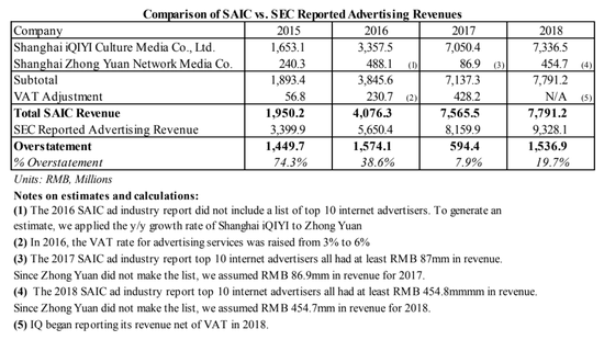 我们根据上海市政府2015年至2018年发布的对广告公司的排名(按收入排名)得出结论,爱奇艺在2015年至2018年期间累计预估的广告收入多报了51.55亿元人民币。“
