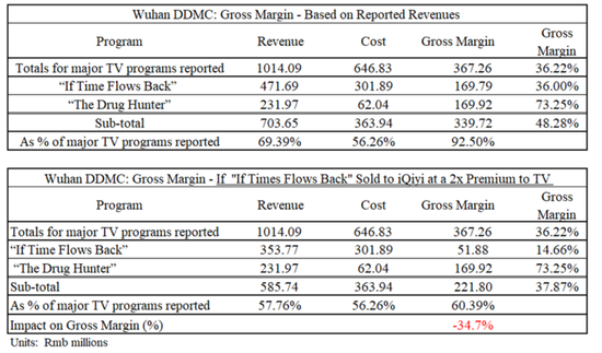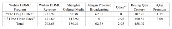 爱奇艺为“毒猎人”支付的价格似乎也高于市场价格。当两个或多个电视台一起播放一个节目时,他们通常支付相同的费率。那么,将此成本分摊公式应用于DDMC这两个节目的总收入和每位客户报告的收入中去,我们发现,爱奇艺为这两个项目都付出了巨大的溢价。如果上海文化广播影视集团和江苏省广播电视集团都为“毒猎人”支付了6.24亿元,我们估计爱奇艺支付的是电视剧价格的1.7倍。