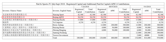 新爱体育的申报材料中从未提及追加非现金投资,也没有将爱奇艺声称的7.5775亿元人民币非现金投资记录到应收账款。2018年,新爱体育获得两轮融资,并两次增加注册资本。新增的投资是以创始股东的出资额溢价出售的,因此出资总额超过了注册资本,超出部分作为资本公积金(“新增实收资本”或“APIC”)列报,并在审计师函中详细说明。