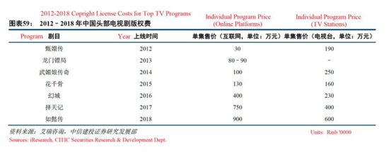 据中国媒体报道,从2016年到2018年,各大网络平台对热门内容的竞争愈演愈烈。这导致一些在线播放许可证的售价是电视台的两倍,尤其是流行的“古装奇幻类”。然而,爱奇艺所支付的额外费用似乎仍然过高。中信证券的一份报告提供了2012年至2018年版权成本最高的一个表格。从2012年到2018年,网络和电视转播商的”大制作“许可费每年都在增长,直到2017年网络和电视的溢价率达到1.88倍的峰值。然而,价格在2018年出现了逆转,溢价下降了20%至1.5倍。