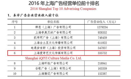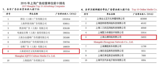 爱奇艺最重要的广告公司是上海爱奇艺文化传媒有限公司(以下简称“上海爱奇艺”)。第二重要的广告公司是上海中原网络传媒有限公司(以下简称“中原传媒”),它们分别单独展开广告业务。爱奇艺在上海工商行政管理总局发布的2015年十大网络媒体公司报告中榜上有名。
