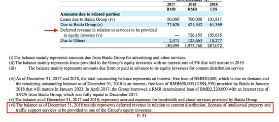 爱奇艺只是以“待交付内容”的形式宣称额外的非现金出资,而爱奇艺对该笔出资的估值约为人民币7.5757亿元(约合1.1021亿美元),从而虚报了投资额。截至2018年12月31日,该笔非现金出资在爱奇艺的账面上记为“向关联方提供服务的递延收入”人民币7.262亿元。