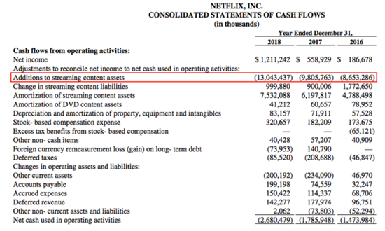 到目前为止,内容授权和制作成本是两家公司最大的支出。然而,爱奇艺和Netflix使用的运营现金流计算方法是完全不同的。Netflix将“所有增加的内容资产”都归为从运营活动中流出现金,而爱奇艺则是将购买授权版权材料归为从投资活动中流出现金。不仅初始购买对IQ的运营现金流没有负面影响,后续摊销对运营现金流也有正面影响。爱奇艺的会计方法显然是为了掩盖其业务正在大量流失现金的事实。相比之下,持续盈利的Netflix则是运营现金流负值。Netflix的现金流量表如下。它将所有用于内容的现金归类为“用于经营活动的净现金”,这导致其运营现金流为负。