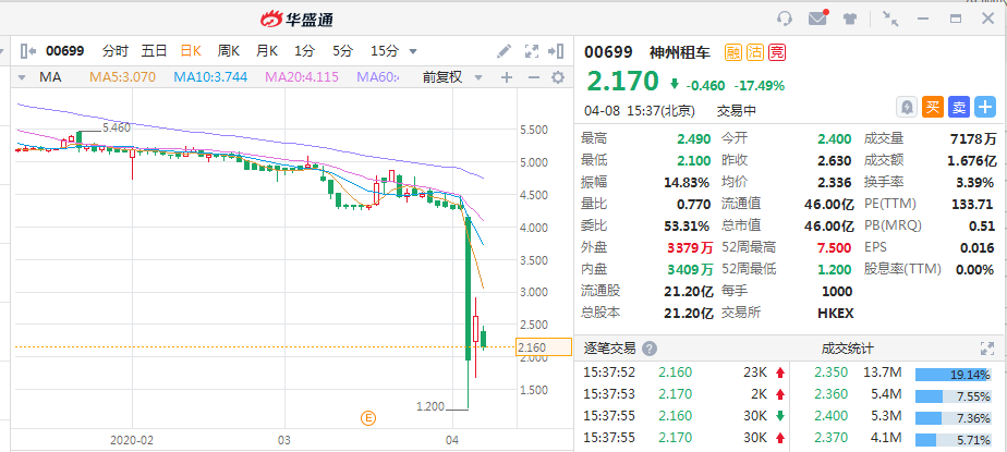 神州租车港股尾盘快速跳水,跌幅扩大至17%