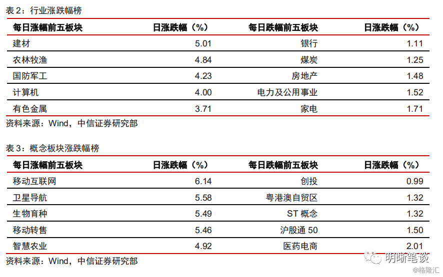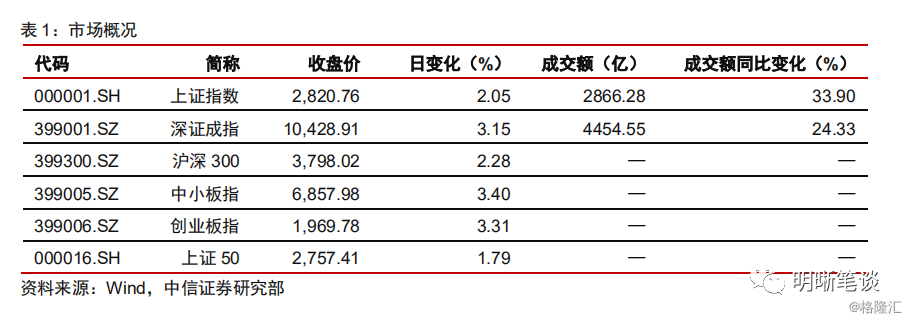 2020年4月7日,银存间质押式回购加权利率全面下行,隔夜、7天、14天、21天和1个月分别变动-26.89bps、-0.79bps、-2.24bps、-62.47bps和-59.55bps至0.97%、1.58%、1.39%、1.38%和1.40%。国债到期收益率全面下行,1年、3年、5年、10年分别变动-31bps、-21.51bps、-13.66bps、-8.53bps至1.34%、1.79%、2.17%、2.51%。上证指数涨2.05%至2820.76;深证成指涨3.15%至10428.91;创业板指涨3.31%至1969.78。