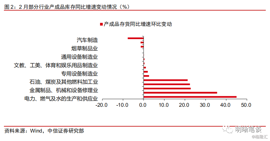 各行业、各所有制企业库存普升,上游行业、国有企业补库最为明显。结合统计局公布的2月工业企业经营数据来看,库存回升并非仅仅局限在某几个特定的行业中,而是涉及到产业链上、中、下游的各个行业,具体而言,电热燃水的供应业的库存同比增速涨幅居首,较前值大幅回升45.0pcts,钢铁行业涨幅次之,录得35.6pcts,化纤、燃料加工的涨幅也明显高于行业均值,涨幅分别为22.4pcts、21,3pcts。靠近终端需求的行业如家具制造业、专用设备制造业、文体用品制造业、电子设备制造业、通用设备制造业、印刷业的涨幅相对较小,分别回升2.6pcts、2.0pcts、0.4pct、0,.4pct、0.1pct、0pct。烟草制品、医药制造业、汽车制造业的产成品库存增速有所回落,分别下降1.4pcts、1.5pcts、7.2pcts。总体而言,上游行业的补库幅度更大。分所有制来看,2月国有、股份制、私营、外商工业企业均有明显补库行为,库存同比增速分别录得20.3%、11.3%、15.5%、0.2%,较前值分别回升15.9pcts、7.5pcts、8.3pcts、3.9pcts,国有企业库存回补的幅度最大。