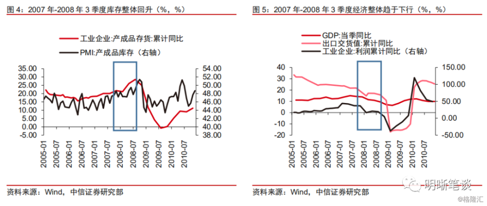 历史上,2007年-2008年金融危机时期我国也曾出现过与当前情况相似的终端需求走弱、企业库存持续回升的现象,最终结果则是库存跟随需求一并回落。2007年-2008年的金融危机早期阶段,我国经济增速有所放缓,工业企业利润、出口交货值同比增速逐渐回落,截至2008年3季度,GDP、出口交货值、工业企业利润同比增速分别由2007年年末的13.9%、21.8%、36.7%回落至9.5%、15.7%、19.4%,而工业企业产成品库存增速则由2007年末的21.8%升至25.0%,PMI库存指数的中枢也在此期间明显抬升,进入2008年4季度,随着金融危机进一步失控,产成品库存也开始跟随终端需求逐渐回落。