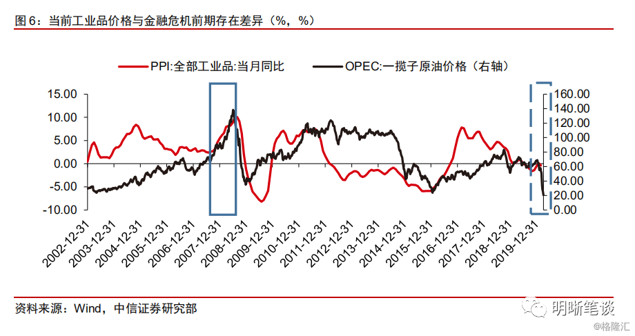 考虑到当前工业企业深陷工业通缩格局,我们认为当前企业库存向需求靠拢的速度将明显快于金融危机时期。2007年-2008年企业库存与企业盈利、终端需求的背离共持续了3个季度,但我们认为在当前的经济环境之中,二者的背离并不会持续如此之久,原因主要在于彼时与当下物价环境的差异:2007年-2008年3季度,尽管在经济增速放缓之下终端需求有所走弱,企业利润增速持续下行,但在地缘政治等因素的影响之下原油价格快速走强,2007年12月的原油价格为90.7美元/桶,进入2008年后,原油价格快速回升,并于2008年7月升至140.7美元/桶,原油价格的攀升也带动了PPI同比增速的快速上行,2007年12月PPI同比增速为5.4%,2008年三季度PPI同比增速升至10.0%附近;与之对比,当下的物价特征之一则是工业通缩较为严重,自2019年下半年以来,PPI同比增速基本位于负值区间,进入2020年2月,PPI同比增速进一步降至-0.4%,在终端需求不振的情况之下,工业品价格回落将进一步加重工业企业的营收和利润压力,从这个角度出发,我们认为当前企业库存与需求的背离时间将明显短于金融危机时期。