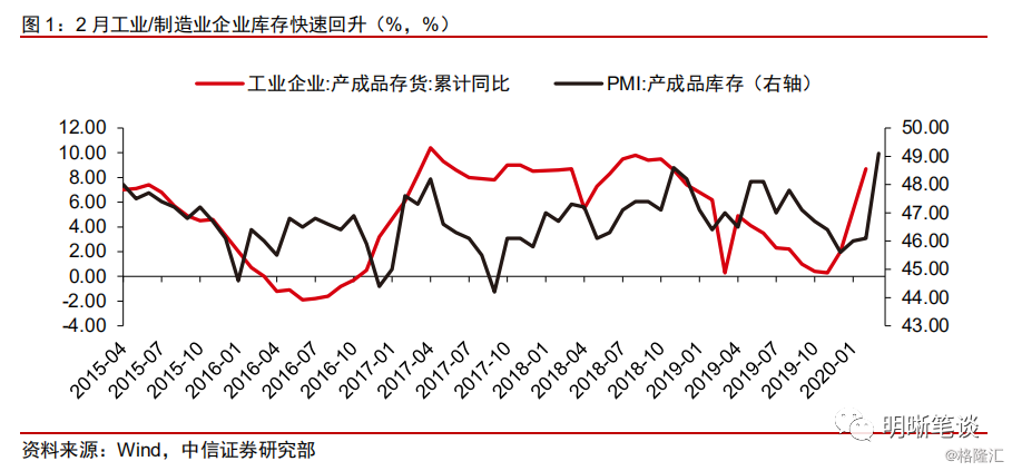 疫情影响之下,1-2月经济数据普降,但工业库存同比增速大幅回升,PMI数据中的产成品库存分项也有明显上行。产需双弱的环境之下库存缘何走强?库存指数的大幅回暖是否意味着新一轮库存周期的开启?本文将就此展开分析。