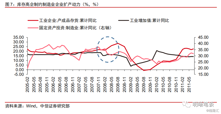 史观工业库存与终端需求的分合。结合历史经验来看, 2007年-2008年金融危机时期我国也曾出现过与当前情况相似的终端需求走弱、企业库存持续回升的现象,最终结果则是库存跟随需求一并回落,对比当前与彼时的经济环境,我们认为企业库存的持续攀升难以为继,企业库存将向企业盈利靠拢,在内需尚未完全恢复、外需仍有收缩压力的环境之下,企业仍有库存去化的压力;同时考虑到当前工业企业深陷工业通缩格局,企业库存向需求靠拢的速度将明显快于金融危机时期。