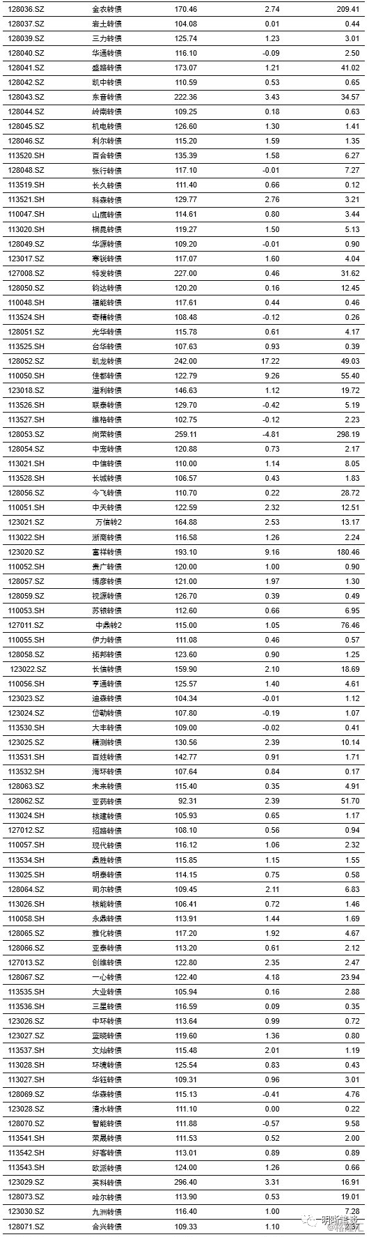 4月7日转债市场,平价指数收于86.88点,上涨2.11%,转债指数收于116.38点,上涨1.08%。225支上市可交易转债,除清水转债、海澜转债、吉视转债和晶瑞转债横盘外,189支上涨,32支下跌。其中,凯龙转债(17.22%)、泰晶转债(10.44%)和佳都转债(9.26%)领涨,迪贝转债(-7.37%)、尚荣转债(-4.81%)和星帅转债(-2.45%)领跌。223支可转债正股,除日月股份横盘外,220支上涨,2支下跌。其中,亚太药业(10.02%)、天汽模(10.02%)、英联股份(10.01%)、星帅尔(10.01%)和翔港科技(10.01%)领涨,仅海亮股份(-0.83%)和今飞凯达(-1.21%)下跌。