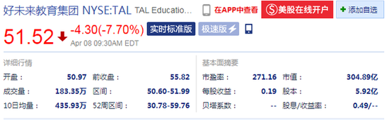 新浪科技讯 北京时间4月8日晚间消息,好未来开盘跌8.70%,报50.97美元。当前市值为304.89亿美元。