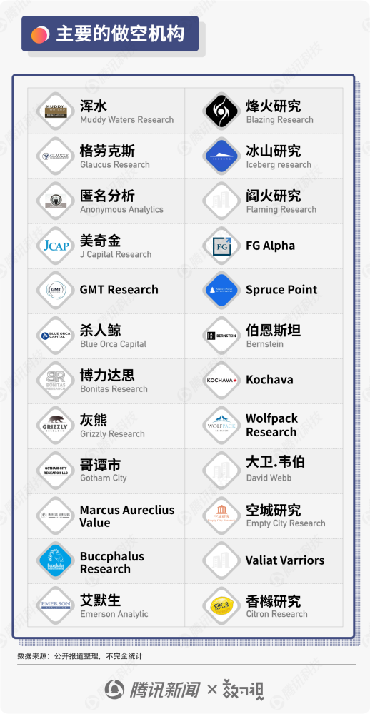 一般来说,做空机构如果看跌某只股票,会向持股者借入(租入)股票卖出,从而获得现金;过一段时间后,再支出现金买入同样份额的股票,将其还给原持股者。如果在这段时间内,股价确实下跌,即为做空成功,做空机构也就能赚取其中差价。国际上有这些著名的以做空为业务的公司。