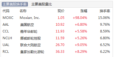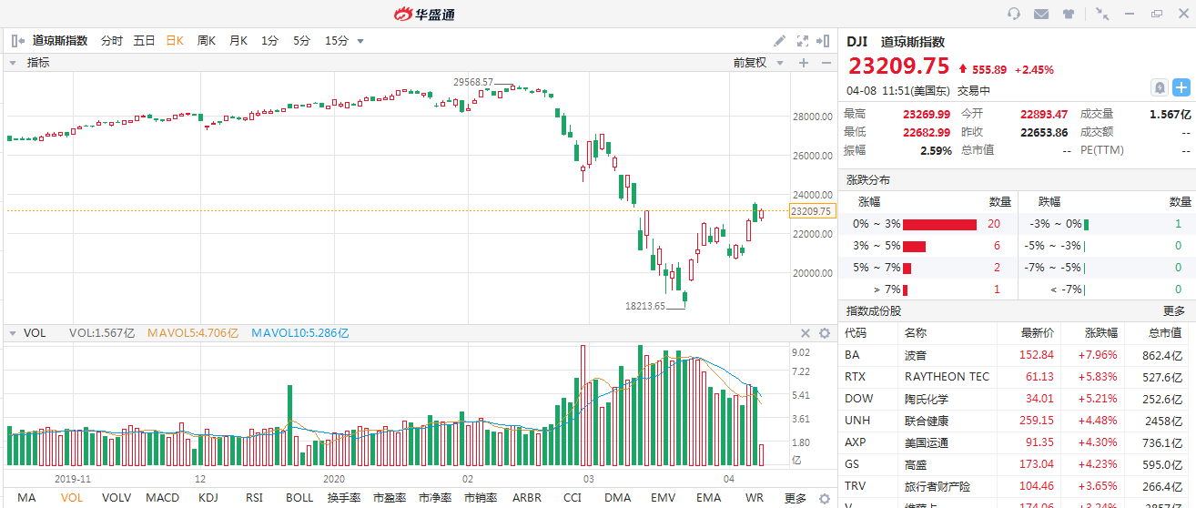 截止4月8日23:55,美国三大股指一度涨超2%,道指涨逾560点。航空股、酒店股、邮轮股再度集体反弹。