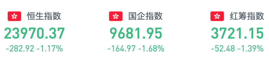 恒指早盘低开0.26%,报24191.32点。截至收盘,恒生指数跌1.17%,报23970.37点,全日成交额达945.36亿。国企指数跌1.68%,报9681.95点,红筹指数跌1.39%,报3721.15点。