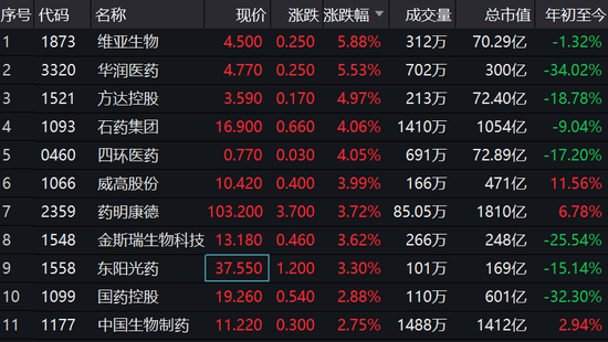 新浪港股讯 4月9日消息,医药股集体走高,其中,维亚生物涨5.88%,华润医药涨5.53%,石药集团涨4.06%,四环医药涨4.05%,药明康德、金斯瑞等涨逾3%。