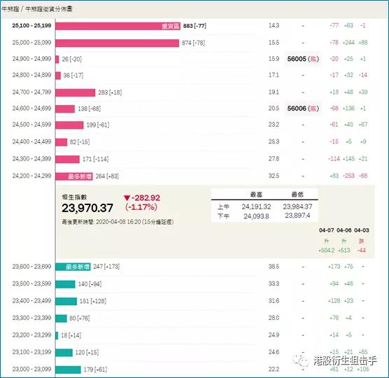 街货分布方面,截至周三,恒指牛证密集分布在收回价22700点至23700点区间,相当约1384张期指合约,而熊证则分布在收回价24200点至25200点区间,相当约2956张期指合约。
