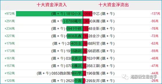 好仓(认购证及牛证)方面,有972万、291万港元资金分别净流入小米、铁塔部署造多,而有少量资金净流出中芯国际套现。