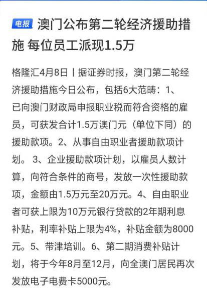据媒体报道,4月8日,澳门政府公布最新一轮抗疫经济援助措施,新计划涉及逾百亿澳门元。当中包括,已向澳门财政局申报职业税而符合资格的雇员,可获发合计1.5万澳门元(单位下同)的援助款项;企业援助款项计划,以雇员人数计算,向符合条件的商号,发放一次性援助款项,金额由1.5万元至20万元。第二期消费补贴计划在今年8月至12月,还将向全澳门居民再次发放电子消费卡。